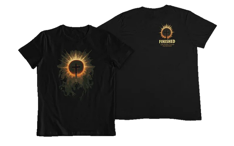The cross silhouetted against a burning eclipse, shadows of sin rising below as beams of divine light break through. Equal parts haunting and triumphant, this del Toro–inspired design wears like an epic movie poster of redemption itself. A stark reminder: Light breaks through the darkness.