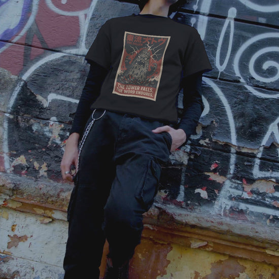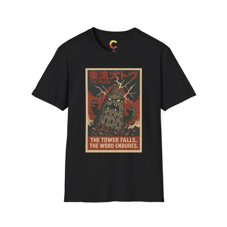 The Tower rises in defiance - only to fall before the Word. The Fallen Tower Tee from our Kaiju Series reimagines Babel as a monstrous skyscraper brought low by divine lightning. Its jagged eyes and roaring maw crumble as cracks of judgment tear across the skyline, in a style inspired by retro Japanese disaster posters and apocalyptic cinema.